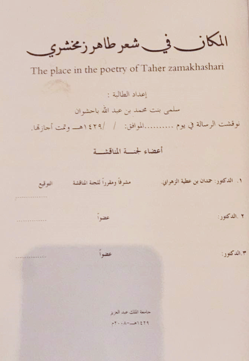 جاء في هذا البحث دراسة عن المكان في شعر طاهر زمخشري وذلك من خلال ربط المكان بالنصوص الشعرية التي تناولت الأماكن منذ العصر القديم إلى العصر الحديث وذلك عند الشاعر طاهر زمخشري – رحمه الله - فقد عرضنا للعلاقة بين الشعر والمكان في الفكر العربي ،وهو تاريخ عريق تُجدد القصائد ما اندثر منه ،ثم تابعنا البحث عن أهمية المكان في الشعر السعودي وتوصلنا للخصوصية التي حظي بها. وتحدثنا عن تنوع أبعاد المكان في النصوص الشعرية وأفردنا الفصل الأخير للحديث عن المكان في شعر طاهر زمخشري بوصفه أحد أبرز الشعراء السعوديين الذين أبدعوا في ذكر الأماكن في نصوصهم ، فليس من السهل على الشاعر أن يتخلى عن أي مكان تربطه به رابطة قوية, فالحديث عن المكان يعد من الضروريات التي يجب إبرازها وإيضاحها, لأن المكان ليس مفهومًا مفرغًا ,سواء أكان المقصود بالمكان المعنى العام أو المعنى الخاص,كما لا يخفى علينا أهمية الأماكن المقدسة وإعطائها حقها ، وكيف وظف الشاعر هذا المكان توظيفًا يليق به كعنصر مهم في القصيدة للكشف عن ذلك الحضور الطاغي للمكان في شعره، وتطور صورة المكان في الشعر لتقديم صورة وافية عن المكان وخصوصيته في شعر الزمخشري بالذات وتوضيح الصورة التي تعامل فيها الشاعر مع عدة أماكن مختلفة ومدى إعطاء الأماكن المقدسة حقها من الأهمية, وارتباطها بالشاعر.