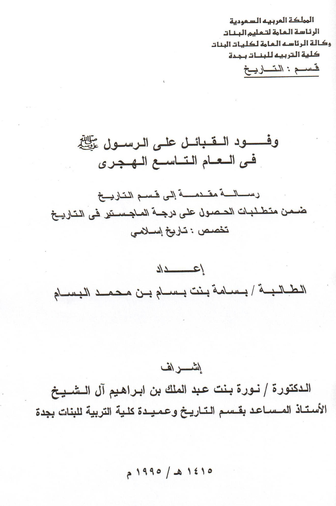 الموضوع الذي تناوله البحث هو "وفود القبائل على الرسول صلى الله عليه وسلم في العام التاسع الهجري" وقد قسم البحث إلى مقدمة وثلاث أبواب وخاتمة وقائمة بالصادر والمراجع. وأشارت المقدمة إلى أهمية الموضوع المطروح للبحث ودراسة لأهم المصادر التاريخية. كما بين التمهيد (الحياة الدينية والسياسية والاقتصادية في شبة الجزيرة العربية قبيل ظهور الإسلام) واحتوى الفصل الأول: "مكانة مكة الدينية بين العرب واستماعهم لأخبار الدين الجديد في موسم الحج والتجارة" وتحدثت عن عرض الإسلام خارج مكة بعد اليأس من استجابة قريش، ومن ثم بشائر الدعوة بين القبائل العرب. كما بحث عرضه صلى الله عليه وسلم على القبائل العربية التي كانت تفد إلى مكة في المواسم حتى قيض الله تعالى له الأنصار من أهل المدينة وامنوا بدعوته واستجابوا له. أما الفصل الثاني وعنوانه " صلح الحديبية وأثره في نجاح الدعوة جزئياً "فقد تم الحديث فيه عن "اثر الغزوات والسرايا في اسلام بعض القبائل" ورسائل الدعوة للإسلام إلى شيوخ القبائل العربية" و "موقف بعض القبائل العربية من هذه الدعوة