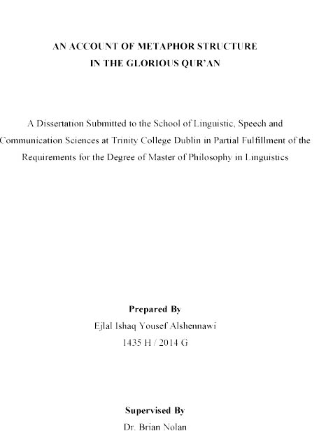 يلقي هذا البحث الضوء على الاستعارة في بعض آيات القرآن الكريم. يرتكز هذا البحث على نظرية المجاز (الاستعارة) المفاهيمي التي نشأت من قبل جورج لاكوف ومارك جونسون. وتتكون هذه الدراسة من ستة فصول على النحو التالي: الفصل الأول يسلط الضوء على الأهداف الرئيسية لهذه الدراسة والأسئلة البحثية، كما يعرض هذا الفصل الخطوات المتبعة في تحليل الاستعارة ويشرح كيفية تجميع البيانات. ويذكر الفصل الثاني اساسيات الاستعارة في اللغة الإنجليزية والعربية، ويعرض مختلف التعاريف، الوظائف وأنواع المجاز بشكل عام. كما يذكر هذا الفصل المقارنة بين الاستعارة والتشبيه والكناية. القسم الأخير من هذا الفصل يستعرض الدراسات البحثية التي أجريت على فن الاستعارة في اللغتين الإنجليزية والعربية. ويقدم الفصل الثالث معلومات عن نظرية الاستعارة المفاهيمية تشمل تعاريف ووظائف وأنواع وخصائص الاستعارة المفاهيمية. كما يذكر هذا الفصل بعضا من المبادئ الرئيسية المتعلقة بهذه النظرية. أما الفصل الرابع فهو مخصص للقرآن الكريم، فهو يلقي الضوء على نزول هذا الكتاب الكريم وكيفية جمعه وترتيبه في كتاب سماوي واحد. كما يتناول هذا الفصل بعض المواضيع الرئيسية التي نوقشت في سور مختلفة من القرآن. يحلل الفصل الخامس الاستعارات التي تم العثور عليها في خمسة وعشرين آية قرآنية. يتم تعريف كل نوع من أنواع الاستعارة المفاهيمية كخطوة أولى، تليها خمس أمثلة من القرآن الكريم. ويتم تحديد هذه الاستعارات وتحليلها بناء على نظرية الاستعارة المفاهيمية. ويناقش الفصل السادس أهم نتائج هذا البحث، كما يعرض أهمية هذه الدراسة ويناقش بعض التوصيات لإجراء المزيد من البحوث.