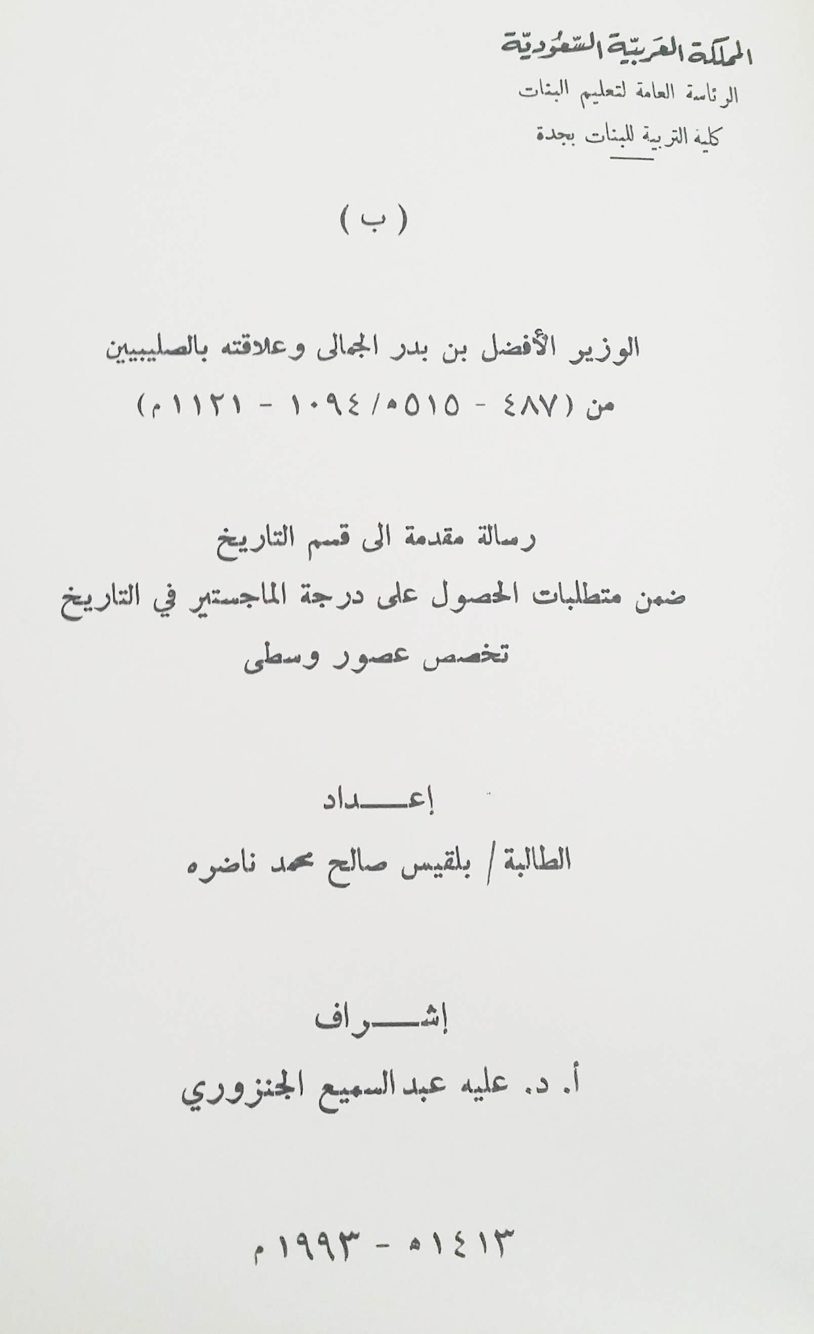 الوزير الأفضل بن بدر الجمالي وعلاقته بالصليبيين من عام 487هـ - 515 هـ / 1094م – 1121م